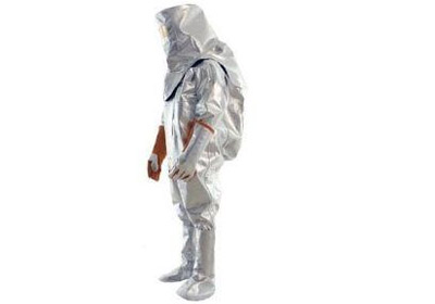 帶SCBA呼吸器背囊連體隔熱套裝,表面鍍鋁隔熱面料(不含石棉),頭罩帶有可更換鍍金大視野面屏手套掌面為牛皮材質(zhì)。
