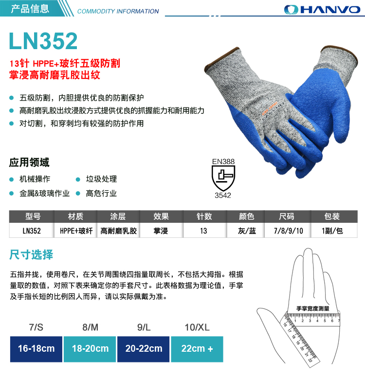 產(chǎn)品名稱:恒輝 LN352 浸膠5級(jí)防割手套