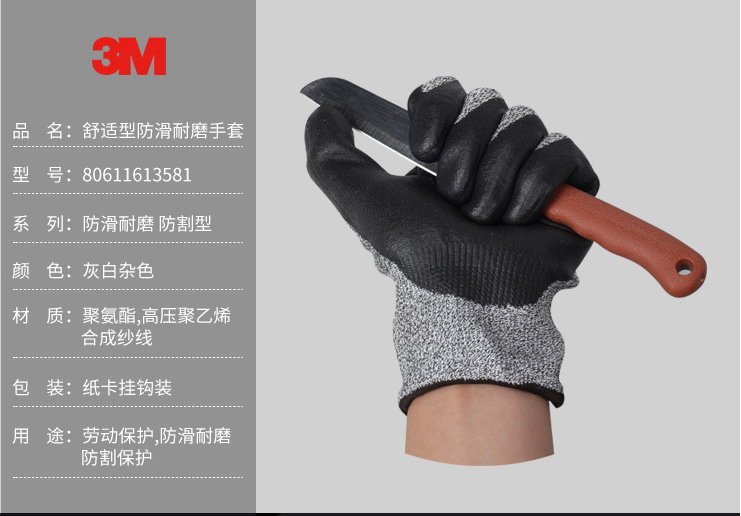 產(chǎn)品名稱:3M 舒適型防滑耐磨手套 防割型 L2 L 手套(貨號80611613581)