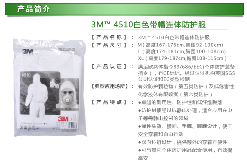 產(chǎn)品名稱:3M 4510白色帶帽連體防護(hù)服M