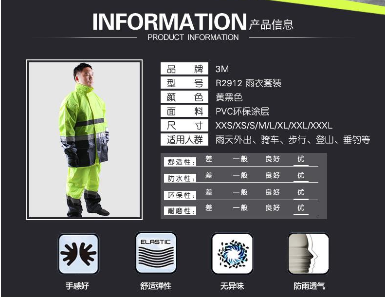 產(chǎn)品名稱:3M R2912 熒光黃拼色PVC防水安全警示服-XS