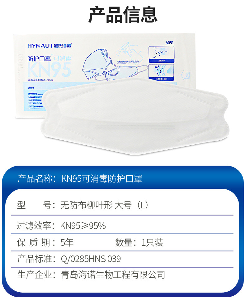 產(chǎn)品名稱:海氏海諾 A051 KN95柳葉型可消毒防護(hù)口罩耳戴式三層獨(dú)立包裝