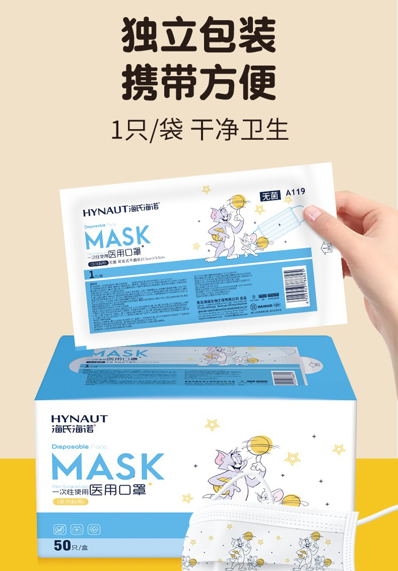 產(chǎn)品名稱:海氏海諾一次性口罩三層獨立包裝(卡通款)